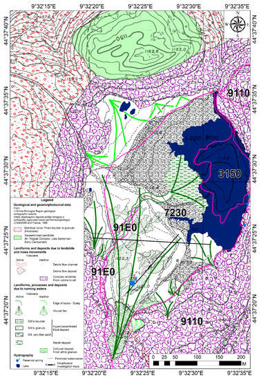 Second, the interference with habitats of the “Natura 2000” Network of Nature Preserves pertaining to the peat bog basin. 91E0*, “Alluvial forests with Alnus glutinosa and Fraxinus excelsior (Alno-Padion, Alnion incanae, Salicion albae)” and 7230, “Alkaline fens” (Figure 6) are the most affected habitats. The first, of primary conservation interest, consists of a strip of riparian forest vegetation dominated by Alnus incana that develops along the tributary of the lake. This is a habitat typically found along watercourses, able to cope with intense river dynamics, and that should therefore not be significantly affected by the alterations caused by the alluvial flood deposit. The habitat 7230 has an important phytogeographical value, because the mountain areas of the Nure Valley are one of the few sites where this habitat type has been found in the Emilia-Romagna Region. This habitat is characterized locally by peat bog vegetation, and is made up of a closed meadow with Cyperaceae (Carex davalliana, Carex nigra, Blymus compressus) and Poaceae, including Sesleria uliginosa. In the biotope two different aspects of this habitat type can be found. The first, developing in correspondence with springs and stagnant waters, is characterized by a substrate with high humidity on which numerous bryophytes and important hygrophilous vascular species develop. These include the rare Menyanthes trifoliata and Drosera rotundifolia, and the protected species Dactylorhiza incarnata, Epipactis palustris, Gentiana pneumonanthe, and Eriophorum latifolium. Menyanthes trifoliata is the dominant species in particularly wet stations. The second aspect is characterized by a drier substrate, and bryophytes are almost absent and the floral component is much poorer, often represented exclusively by Carex nigra and Sesleria uliginosa. The wettest aspect of the habitat, characterized by a greater naturalistic value, is also the most sensitive to the impact caused by the flood deposit. Figure 7 is an original contribution that shows lithological variations of the flood deposit due to down-slope-motion transformations, the areal importance of the deposit, and its interaction with the habitats of the Natura 2000 network.
