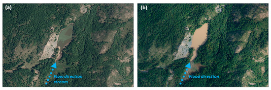 (iv) In a few hours, the large rainfall amount resulted in concentrated runoff in small catchment areas. The inclinations and the related confinement of streams and rivers have contributed to producing and emphasizing this erosive phenomenon. Contrastingly, Figure 11 shows how the riparian vegetation was instead completely covered by the flooded sediment nearby the main inclination breaks in downhill segments of the stream network (Figure 3b(4)).