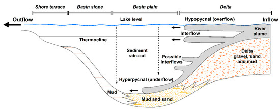 Conceptual model of sediment dispersal and associated deposits within a lake basin dominated by clastic sedimentation. Figure not to scale, modified from [30].