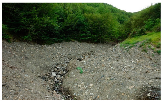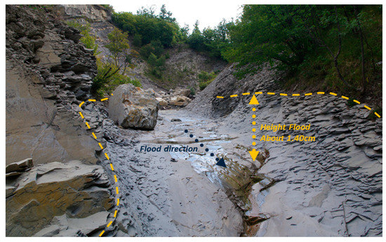 High-discharge (hyperconcentrated) flows occurred, generally, along gullies, and 1st to 3rd order streams according to Strahler’s hierarchy. The source area usually coincided with the head, or higher portion, of the channels, and the material involved was mainly derived from alluvial and colluvial deposits Figure 3b(1). The flowing masses followed the path of the channels, generally steep (between 35° and 45–50°), sometimes filling their transversal sections completely. Along the path, the flowing masses continued to pick-up material from the stream banks, leaving scarps of variable height (from 1–1.5 to 2 m), completely modifying the channel morphology (Figure 3b(2)), both in depth and width. Locally, erosion caused the occurrence of landslides, mobilized downhill from the torrent valley slopes. The deposition of material (Figure 3b(3)–(5)) occurred at the first relevant diminishing of steepness of the channel, usually at the confluence between streams, due to the loss of the stream capacity to sustain the load in charge. The deposits are typically openwork or clast-supported, made by poorly sorted, abundant, angular to sub-rounded gravel, cobbles, sometimes boulders, and large floating material, including trunks and wood pieces. Where enough space existed, the deposits were fan-shaped (Figure 3b(4)). The material was deposited often in correspondence with the narrowing of river-bed sections caused by the intersection with man-made structures, like roads, bridges, and manufacts built up as a local protection against erosion effects. Poorly sorted deposits show crude down-current clast orientation, and crude inverse up-grading (Figure 3b(5)); they contain sand matrix, being locally matrix-supported, where the deposition occurred within the channel, caused by obstacles or breaks in steepness.