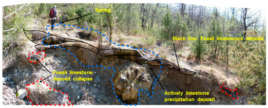 Example of limestone-precipitating springs (LPS) distributed along slopes to forming limestone clusters above the rivulets and streams of nearby springs.
