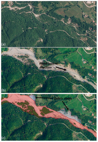Satellite imagery of the Nure River before (a) and after (b) the high-discharge flood in September 2015. (c) Example of removal of the ligneous vegetation cover in the streambed of the Nure River, eroded areas are in red.