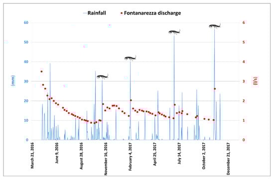 Flow rate (red dotted line), Niphargus occurrences, and precipitation data (blue bar histogram) obtained from perennial springs, monitored in the Northern Apennines, modified from [33].