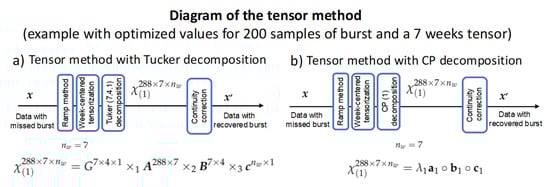 The second operation is the tensorization of the data, which is the process of packaging lower-dimensional data into a container, the tensor, with more dimensions than the original one. This allows to find the relations between dimensions, which are difficult to perceive in more simple structures. Because of a visual inspection of the data seems to reveal patterns on a daily and weekly scale, in order to take advantage of these regularities, a 3-dimensional tensor was composed. The proposal was to build a three-dimensional tensor  in which, the first index indicates the 5-min day-intervals fixed by the sample frequency of the SCADA system, the second index indicates the day of the week and, the third index depends on the number of weeks  included in the tensor. According to this, . The proposed organization uses past and future data with respect to the burst location in order to contribute with past and future information. The week where the burst is located is placed in the central week index, and some weeks before and some weeks after are taken, depending on the tensor size . Note that to always have a central week in the tensor  must be an odd value (3, 5, 7, …). We refer to this tensorization as week-centered tensorization. As we can see, it collects data corresponding to a whole number of weeks. The third operation consists of constructing a simplified version of the tensor, named  in Figure 1 by using a tensor decomposition. In Figure 1a it was represented the Tucker decomposition in Figure 1b the CP. This operation reduces the irregularities introduced by the linear estimator used in the first operation. The last operation is the continuity correction, Section 3.3.4, used to guarantee the continuity of the signal in the extremes of the restored burst. In Section 3.3.2 there is explained the ramp method. An overview of the main tensor decompositions are presented in Section 3.2 and Section 3.3.4 for the continuity correction process.
