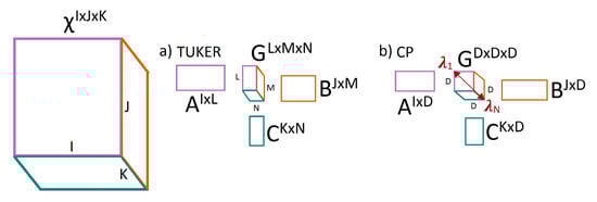 Many known tensor decompositions exist but overall of them the most widely used are the Tucker [] and the CP [] ones. These two are briefly presented below for the three-dimensional case.