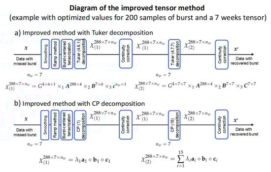 This method starts by filling the lost burst values to avoid missing elements before to tensorizing the data. The main significant differences and contributions are introduced: (1), to fill empty values the most straightforward interpolation is chosen, which we called ramp method, discarding other computational more intense strategies as [,,] or as the one used in [], (2), a new way to organize the tensor, called burst centered tensorization, is introduced, and (3), there is applied a two-step reconstruction process by concatenating two tensor decompositions of different tensor cores. Each time the data is reconstructed, the continuity correction method is carried out. The first tensor decomposition has a very small-dimension core and obtains a rough approximation which is refined thought a second reconstruction done by applying a tensor decomposition with a bigger core. Note that, although several tensor decompositions exist, the two most extended and well-known are the Tucker [,,] and the CANDECOMP/PARAFAC (CP) [,] which are the two decompositions considered in this work as well as in []. At this point, we could combine different types of tensor decompositions, the results obtained employing CP and Tucker are very close so, in order to maintain the text simplicity, this study only considers these two. References [,,,] can provide the reader a quality introduction to the tensor algebra.