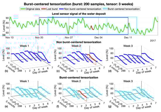In the data completion methods that use tensor techniques, as far as we know, the way to organize the data into a tensor does not take into account the position of the lost data. In this work, a burst centered tensorization method is proposed, where the data selected to fill the tensor depends on the burst location. Figure 6 shows this process. In Figure 6a, the dark blue window shows the selection of data as was proposed in [], in a typical way and with the data presented in a uni-dimensional view. Through the dark blue window it can be seen how the burst is not exactly located in the center of the selected data, which would mean being in the center of the dark blue window, even if the week where the burst is located is selected as the central week. This happens because the burst is hardly located in the middle of a week, which only happens if the burst is located exactly in the center of Thursday. The burst centered tensorization forces the burst to be located in the center of the data selected. The cyan window in Figure 6a shows this new data selection, where the burst is placed exactly on the center of the window. Figure 6b–d show the tensorized data by the typical way. The Figure 6e–g show the tensorized data from the burst centered tensorization method, which placed the burst in the core of the tensor (in the center of the central day of the week, which is located in the middle of the tensor). As explained in [], lost data bursts never exceed the day, meaning that their length, B, is always less than 288 samples and that the burst can be located in the center of a day. Thus, given a B burst in a tensor , the burst samples are placed at ,  with initial position  = 0.5(288 − B) according to and indexation . Note that the daily cycles of the burst centered tensorization rarely start at 00:00 and the weeks do not start on Mondays, as occurred in [], however there are always the same number of samples before and after the lost burst, which hardly happens with the previous tensorization method.