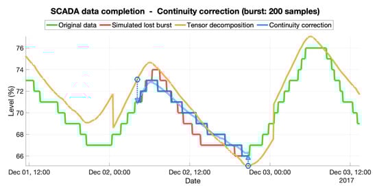 In a previous study [], an ad hoc method that combines a tensor decomposition and linear prediction techniques was implemented. The method was specially adapted to work with the water deposit level signals and to deal with long bursts of lost samples. That approach was compared with other reconstruction methods based on tensor techniques found in the literature, providing better results for these specific conditions. The work in [] also presented a continuity correction method that guaranteed the continuity of the signal of the data recovered. The method presented in this paper is reminiscent of [] in some aspects, but gives some novelties that significantly impact the performance, improving it very considerably.