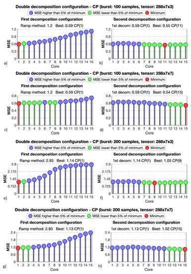 As important aspects to emphasize, notice that in all the tested conditions of B and , the best decomposition core for the first decomposition is the lowest one, CP(1). Notice also that, in all cases, the second decomposition improves the performance of the algorithms and further reduces the MSE error per sample. If we look at the second decomposition dimensions we see that the performance of the algorithm usually improves when D is higher although the MSE tend to stabilize. In this case, there is no better value for all B and  combinations but choosing a high value, for example, D = 15, we will always get results very close to the optimum. Therefore, for the CP method, the choice of the first decomposition core is very robust, and it has to be the lowest one. Then, for the second stage a higher decomposition core has to be selected, taking into account that there is a wide margin of acceptable configurations (values highlighted in green) because when the minimum is reached, the choice of an even higher decomposition core gives a very similar MSE.