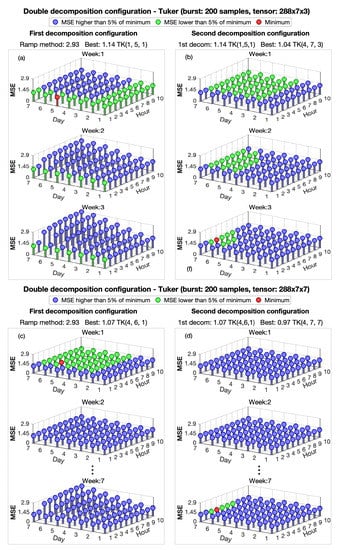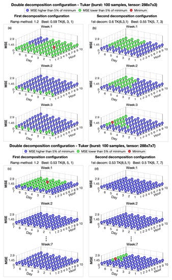In this case, we proceed in a similar way to the previous case; first, we adjust the first decomposition. We evaluate the MSE obtained in the first five steps (blocks) of the algorithm in Figure 3a for a given range of i, j, k corresponding to the decomposition TK(i,j,k). We will obtain a three-dimensional tensor with the MSE values. The i, j, k values that produce the lowest MSE determine the dimension of the first decomposition. Once determined the order of the first decomposition, we recalculate the MSE, now with the complete algorithm, sweeping the same range of values i, j, k for the second decomposition. We will obtain another three-dimensional tensor with the MSE values and we select the i, j, k that produce the minimum MSE.
