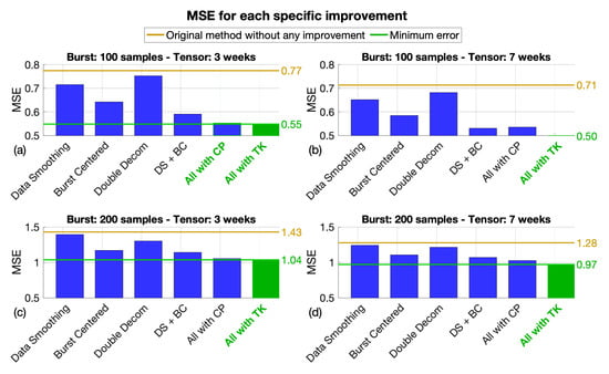 MSE of the proposed improvements. All of them are tested with 100 and 200 samples of data burst lost and with 3 and 7 weeks of tensorized data. The orange line indicates the best result obtained in []. The Smooth is the result of applying only the smooth process to the signal before tensorizing it. The burst centered tensorization is the result of the rearrangement of the tensor according to the burst location. The Double decom is the result of applying the decomposition two times, with  and  for Tucker, and  and  for CP. The DS-Bc is the result of combining the data smoothing and the burst centered tensorization without using the double decomposition. The All with CP and the All with TK are the results of applying all the proposed algorithm with the CP and the Tucker models respectively.