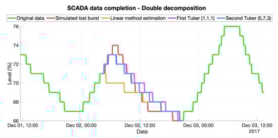 Different estimators based on interpolation or in linear prediction techniques were used to restore lost samples [,,] with acceptable results, but in the case of large amounts of consecutive lost samples, the performance of these estimators falls dramatically. However, this type of data loss is frequent as it is caused by a communication failure between the Programmable Logic Controller (PLC) where the sensor is connected, and the central SCADA server where the data is stored. The reason seems to be that classical data estimation methods hardly exploit patterns that occur on a combination of time scales, such as daily and weekly scales, as occurs in our case of study. In contrast, methods based on tensor decomposition are capable of revealing these patterns when the data are properly ordered in a multidimensional way [,,,,,].