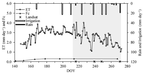 Irrigation was performed according to local practices, with a general rule of applying 22 mm of water to each field approximately every 12 days based on farmers’ reports. However, observed irrigations over Field 7 showed that there is some variability in irrigation dates, with a total of 6 irrigations with 22 mm and a seventh one with about 11 mm, with an average of total applied irrigation depth of 143 mm throughout the growing season. The irrigation schedule over the other fields also showed similar variability (Appendix A—Figure A1). Unnecessary vegetation development increases crop water consumption, reduces soil water storage, and increases irrigation requirements. Therefore, the shoots were pruned in the experimental field around day of year (DOY) 187 and no new leaves or stems were observed after that date. So, the fractional vegetation cover (Fc) remained stable at 30%, as shown in Figure 2 [23]. The vegetation height at the beginning of the growing season was 70 cm and 164 cm by the end of the season, with an average width of foliage of 70 cm.