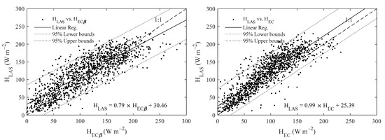 The comparison between HLAS and HEC showed some discrepancies, as indicated by an RMSD of 25 W m−2 (R2 of 0.77) with a narrow dispersion around the 1:1 line within a 95% confidence interval (Table 1 and Figure 4). A slightly lower agreement was observed between HLAS and HEC β, with an RMSD of 28 W m−2 (R2 of 0.72) and a wider dispersion around the 1:1 line. Also, the slope of the regression lines of 0.99 and 0.79 indicate a better agreement between HLAS and HEC compared to HLAS and HEC β, respectively. These comparisons indicate that the use of the Re method in this study to address lack of closure provided a better agreement compared to the BR method. Therefore, the analysis was completed using the Re method.