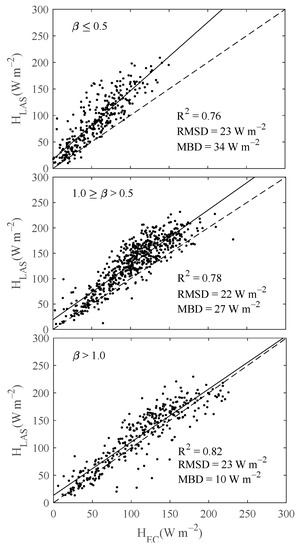 The effects of soil moisture temporal variability on HLAS were evaluated using β. Generally, higher soil moisture content can lead to an increase in LE (and ET), decrease in H, and, consequently, lower β values [35]. In this study, β values were divided into three categories, including β ≤ 0.5, 1 ≥ β > 0.5, and β > 1. The first two categories generally indicate that LE (and ET) > H. The third β category indicates that H > LE. A comparison between HLAS and HEC for each β category is shown in Figure 5. The data in the third β category suggest that the site experienced relatively drier conditions compared to the other two categories. At β ≤ 0.5, HLAS overestimated HEC by a mean bias difference (MBD) of 34 W m−2. At 1 ≥ β > 0.5, the MBD decreased to 27 W m−2, and at β > 1, HLAS underestimated HEC by an MBD of −14 W m−2. In other words, as β increased (i.e., drier surface conditions became dominant), the agreement between HLAS and HEC improved as the MBD consistently decreased. Also, R2 of 0.76, 0.78, and 0.82 for β < 0.5, 1 ≥ β > 0.5, and β > 1, respectively, show consistently improved agreement between HLAS and HEC as β increased.