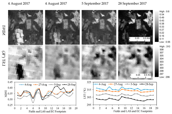 Four pairs of Landsat 5 images that consisted of LST and surface reflectance were used to characterize surface heterogeneity over the study site during the measurement period. Top of the atmosphere temperature images were atmospherically corrected to obtain at-surface LST using the radiative transfer model MODTRAN 4 [34]. These images were acquired during clear sky conditions on 4 and 27 August, and 5 and 28 September (Figure 2). Both datasets have a 30-m spatial resolution that allowed to account for field scale variability. Surface reflectance in near-infrared (NIR) and red bands were used to calculate NDVI as (NIR − Red)/(NIR + Red).