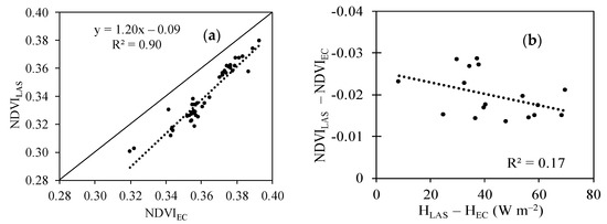Scatter plots of (a) NDVILAS and NDVIEC, and (b) NDVILAS − NDVIEC compared to HLAS − HEC.
