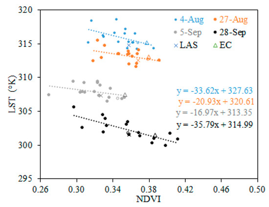 As an initial evaluation, the obtained TVDI, which ranged from 0–1, was plotted against HEC (not shown) to make sure that it followed the known behavior, as described by [27,28,46,49]. A positive correlation between TVDI and HEC was obtained. The lowest average TVDI (about 0.20) was on 28 September and corresponded to the lowest average LST (~302.2 °K). The observed behavior of the TVDI in this study agreed with the fact that higher TVDI corresponds to drier conditions [28,46,49], higher LST − Ta [29], and higher H [28,29].