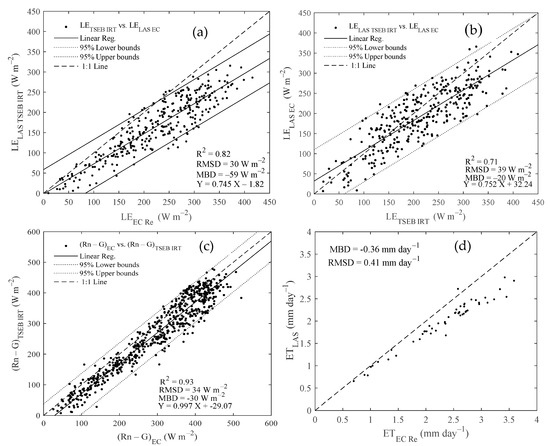 The TSEB model was used to estimate HTSEB and (Rn − G)TSEB that can be used to evaluate both HLAS–HEC and HLAS–HTSEB against TVDI and to calculate LELAS, respectively. The TSEB model was applied using two LST datasets from the Landsat images and the IRT. Estimates of H based on the Landsat data (or remote sensing) (HTSEB RS) and those based on the IRT (HTSEB IRT) are shown in Figure 9. Two different comparisons were conducted—HEC against HTSEB IRT and HLAS against HTSEB IRT. The comparison between HEC and HTSEB IRT showed an RMSD and R2 of 35 W m−2 and 0.71, respectively, with a narrow scatter distribution around the 1:1 line. Slightly lower agreement was obtained between HLAS and HTSEB IRT, with an RMSD and R2 of 51 W m−2 and 0.64, respectively. One of the main reasons for the increased discrepancies between HLAS and HTSEB IRT was attributed to differences in the spatial representation of HTSEB IRT (at a point) to that of HLAS. Estimates of HTSEB RS did not have enough data points that could be meaningfully evaluated. However, a visual inspection of Figure 9 showed that the footprint-integrated HEC and HLAS were closely correlated with HTSEB RS. Overall, these TSEB model results are consistent with previous studies [14,35,50,56,61,62] and allowed the use of HTSEB IRT to characterize surface conditions.