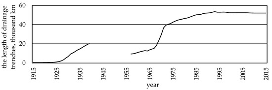 The length of drainage trenches had an effect on the density of the total Lithuanian hydrographic network. What concerns the total length of trenches in the territory of Lithuania it was obviously increasing. In 1930, the density of trenches was 0.1 km/km2, in 1945—0.34, in 1960—0.69, in 1975—0.76, and in 1999 even 0.96 km/km2. Such density of ditches was determined by the deepening, widening and straightening of natural stream channels, i.e., after they became main drainage trenches, and later—regulated streams. In such a way the length of regulated streams reached 46,000 km [8,9].