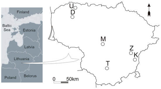 The research was carried out in Lithuania, in the Baltic Sea region, in the Nemunas and Venta river basins. The research included regulated and unregulated stretches of the following streams: Terpinė (T), Žalesa (Z), Kuosinė (K), Mėkla (M), Durbinis (D), and Uogis (U). Distribution of the relevant stretches in the territory of Lithuania is given in Figure 2 and Table 1. The relevant stretches were coded. The first letter indicates the relevant stream according to the first letter of its name. The second letter indicates whether the stream is regulated or natural (the sampling place in the natural stream channel is marked by N, in the regulated—by R). The beginning of the stretch is marked by s; the end—by e.