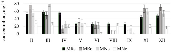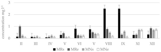 The worst water quality was observed in winter months since at this time of the year maximum concentrations of nitrogen oxides were determined which corresponded to the poor or bad ecological status: in Terpinė stream, at point TRe (41.5 mg L−1, in December); in Mėkla stream, at point MNs (81.4 mg L−1, in March); MRe (76.4 mg L−1, in February); in Kuosinė stream, at point KRs (24.5 mg L−1, in January); in Durbinis stream, at point DRe (26.1 mg L−1, in December). During vegetation period nitrate concentrations were lower. This was especially characteristic of the Durbinis, Mėkla (Figure 3), and Uogis streams (Figure 4). However, in the Kuosinė (Figure 5) and Terpinė streams the relatively large nitrate concentrations were measured even in vegetation period. This could be caused by a more abundant fertilization of arable lands in summer and autumn. The average annual consumption of fertilizers in Lithuanian agriculture in recent years (2016–2018) is 162,000 tons of nitrogen (N) and 52,000 t of phosphorus (P2O5). Winter crops were fertilized with 100–150 kg (N) ha−1 and 50–75 kg (P2O5) ha−1, sugar beet 100–130 kg (N) ha−1, and 80–90 kg (P2O5) ha−1 [39]. As a result, a higher amount of nitrate pollutants is washed out into the rivers. In summer time, due to a shallow water the river water is less diluted.