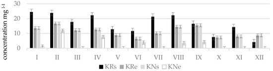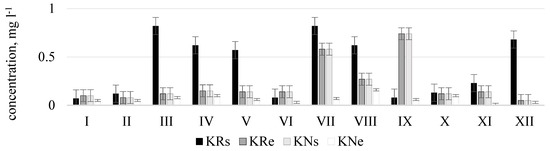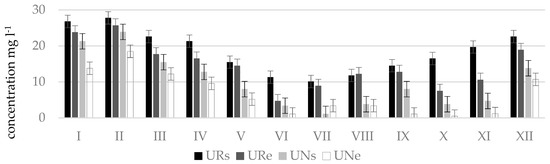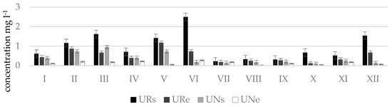 The measurement results showed that phosphate concentrations according to their amount and period, same like nitrates, are distributed rather differently and water quality in streams frequently exceeded the limit value for good ecological status (phosphate concentrations 0.28 mg L−1) and corresponded to the poor or bad ecological status (Figure 6). Very high phosphate concentrations were measured in the Durbinis stream where no seasonality was observed since phosphate concentrations were very high during all months. The maximum concentration measured was 2.5 mg L−1. Based on this concentration the river water corresponded to the bad ecological status (>1.23 mg L−1). In Uogis stream (Figure 7), according to phosphate concentrations in water in a period of even four moths (March, May, June, and December) at the beginning of regulated stretch (point Urs) the ecological status of the stream was bad, however at the end of natural stretch (point Une) in a period of six months (March, April, June, July, November, and February) the stream had a prevailingly good ecological status, and in the remaining six months (May, August, September, October, December, and January) high ecological status. According to phosphate concentrations the Kuosinė stream (Figure 8) represented high ecological status of water quality in January, February, June, and October as well as poor ecological status in December, March, and July in KRs stretches