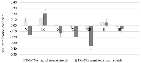 Decrease in the average nitrate () concentration in natural and regulated stream stretches was 8.8 ± 5.0 and 3.0 ± 2.9 mg L−1, respectively. The average nitrate self-purification coefficient, at a confidence level of 95%, in natural stretches was 0.50 ± 0.22, in regulated stretches −0.15 ± 0.21 km−1, and this difference is essential.