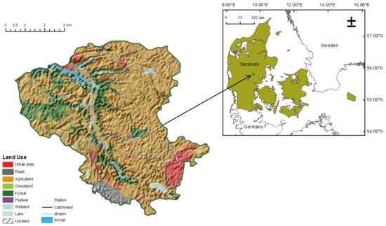 - Windolf, J.; Thodsen, H.; Troldborg, L.; Larsen, S.E.; Bøgestrand, J.; Ovesen, N.B.; Kronvang, B. A distributed modelling system for simulation of monthly runoff and nitrogen sources, loads and sinks for ungauged catchments in Denmark. J. Environ. Monit. 2011, 13, 2645–2658. [Google Scholar] [CrossRef] [PubMed]