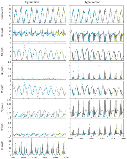 As NO3 constitutes the main part of TN, TN concentrations showed the same trend as NO3 concentrations. The modeled TN and NO3 generally tracked annual and seasonal dynamics of the monitoring data. However, modeled NO3 occasionally missed maxima and minima (e.g., 1998; Figure 2), and so did TN. While the modeled NH4 successfully captured trends in concentrations during the entire period 1996–2005, the monitoring data in the summer were underestimated, particularly at some high peaks. NH4 concentrations in the epilimnion showed a bit of a poor fit, and the model lacked the capability to simulate seasonal peak dynamics in both the epilimnion and the hypolimnion. NO3 and NH4 had only one peak per year, in spring and in autumn, respectively (Figure 2). Then, NH4 concentrations started to increase in summer, mainly at the bottom of the water column.