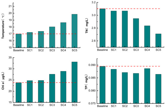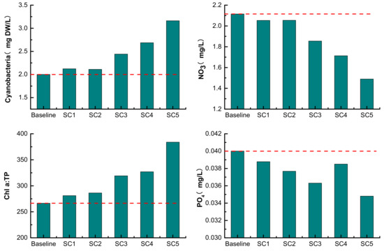In the five extreme temperature scenarios, summer Chl a concentrations increased gradually, and cyanobacteria contributed progressively more to the overall phytoplankton biomass, as seen in other model studies of climate warming effects [11,31]. Because the last two scenarios were applied for the whole year instead of only summer, the intensity of the diatom bloom was greater compared with baseline and the first three scenarios. Therefore, with the warmer climate, extensive surface NO3 and PO4 consumption occurred in summer, reflected in increasing phytoplankton biomass, especially cyanobacteria. Since NO3 and PO4 are the main components of TN and TP, respectively, the dynamics trend of TN and TP changed with the variations of NO3 and PO4. The first three scenarios (SC1–SC3) were applied only in the summer, and for the last two scenarios (SC4 and SC5), warming was applied year-round. Sediment nutrient release mechanisms and remineralization are related to the temperature [32]. Thus, compared with the SC1–SC3, more phosphorous under SC4 and SC5 could potentially be released from the sediment [33] not only in summer but also in spring and in autumn. Thus, phosphorus concentrations in SC4 were also overall slightly higher than those in SC3.