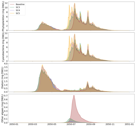 Simulated phytoplankton, cyanobacteria, diatom, and other algae biomass of baseline, SC3, SC4, and SC5 during the last simulation year (2050).