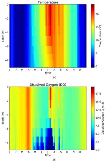 Simulation for the whole water column in 2050 in base scenario. (a) Temperature; (b) DO.