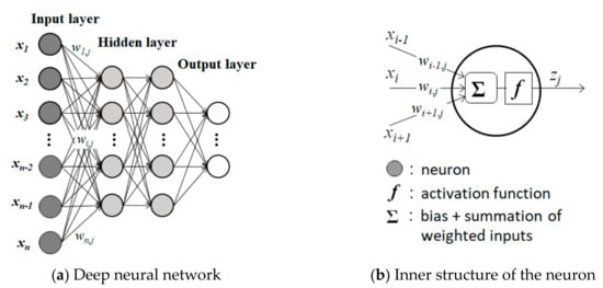 Structures of artificial neural network (ANN) model that show (a) data flows in the ANN with deep learning (○ = neuron) and (b) the inner structure of a neuron of jth with i-1th, ith, and i+1th inputs with weighed coefficients.