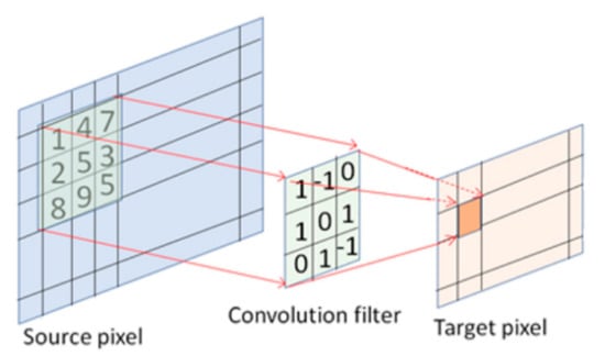 A CNN is a type of ANN architecture with a deep-learning approach. We created a relatively simple algorithm of a CNN based on past studies [16,23]. The variables in Equations (1) and (2) are mapped to the 2D spatial image in the CNN, which consists of a convolution layer (convolution) and a max-pooling layer (pooling). We consider that the input variable x has L × L 2D source pixels, which is filtered with a H × H small window of convolution with a table of weighted values. The convolution takes the same size of values from the source image, and then multiplies the weighted values of the H × H window to the filtered values of source pixels. The filtering is repeated over the source image by shifting the window. Components of the input and filter are defined as xi,j (1 ≤ i ≤ L, 1 ≤ j ≤ L) and wk,l,n (0 ≤ k ≤ H − 1, 0≤ l ≤ H − 1, 1 ≤ n ≤ N), respectively. This process is shown in Figure 3. Note that a zero-padding technique was introduced to ensure that the size of input is equivalent to that of the output. The xi,j is multiplied by wk,l,n while separately shifting a grid at (i,j) on the filtering. This equation, including the convolution form and bias bn in the function, is expressed as follows: