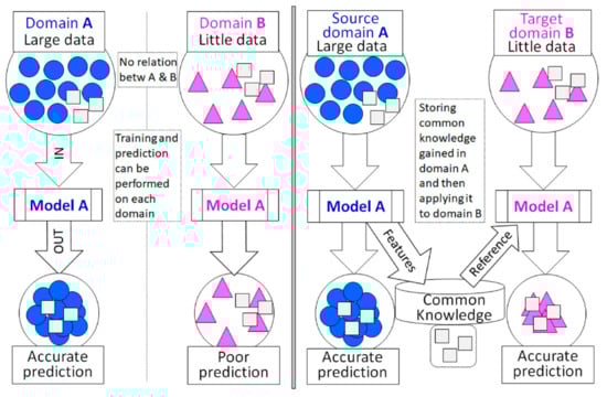 Simple overviews that show the model predictions with transfer learning (right) or without (left) transfer learning in Domains A and Domain B. The transfer learning extracts the features as common knowledge from Domain A and then applies common knowledge to predict in model B.