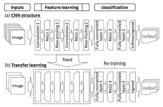 Data flows in procedures (a) CNN and (b) CNN with transfer learning.
