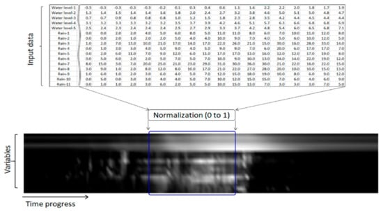 To perform time-series predictions with the CNN, a conversion method between time-series data and image data is necessary. As shown in Figure 6, our method was a simple way to arrange 16 variables (rainfall and water level) at all gauge stations from upstream to downstream on the vertical, and to arrange the temporal variation of each variable on the horizontal. The digital values were then converted to an image by using a black-and-white gradation that ranges from zero to one and is normalized by the maximum and minimum values of all observed datasets of water level and rainfall. The spacing between two values on the horizontal axis was one hour. The interval of the vertical axis was one for simplicity.