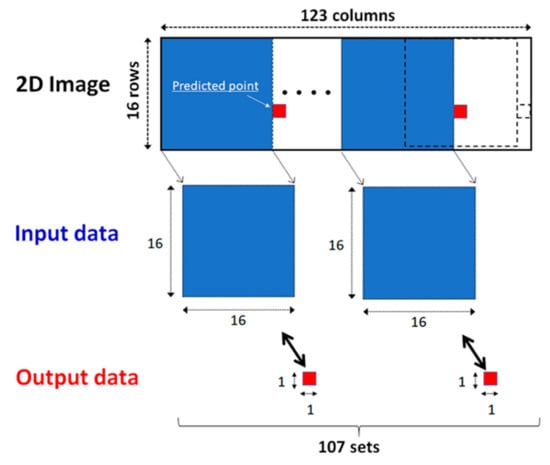 The image in the CNN has to correspond to a value of the water level in the time progress when train and prediction are conducted in the CNN. A 16 × 16 image was selected from the 2D image of a flood event due to the limited number of variables. A square image is used as input data. The information from the input data was associated with a 1 × 1 image (i.e., value) of the output data at the predicted point. We assumed that the flood-related information in a square image generates the value of the predicted point in the next time step (i.e., in an hour). Note that the predicted point indicates a location where water levels are predicted. This treatment was separately repeated in time progress as shifted from the head of the 2D image to the tail. Drawing information is shown in Figure 7. This data treatment was also employed when the LSTM predicts the value in advance using current and 15 past data values provided from 16 variables. The LSTM searches the relationship among plural line-based data; however, the CNN finds spatial patterns among 2D images.