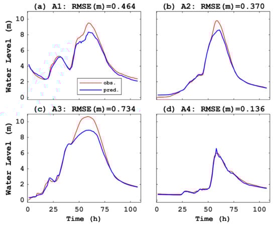 Comparisons between observed data (obs.) and prediction (pred.) in four test datasets of water level (m) versus time (hour) in domain: (a) third highest flood event, (b) second highest flood event, (c) highest flood event, and (d) moderate peak flood event.