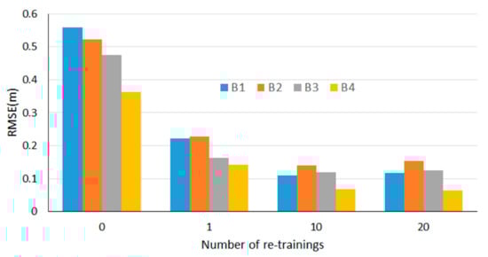 After the verification of the CNN via the training, validation, and testing processes in Domain A, the transfer learning on the fully connected layers 1 and 2 was conducted in Domain B. The number of retrainings can be an important factor for improving the prediction of the CNN transfer learning. We evaluated how RMSEs are reduced based on the number of retrainings. Figure 9 shows the RMSEs for all cases (B1–B4), which are calculated by the observed and predicted water levels with respect to the number of retrainings. The number zero in the horizontal axis means that the CNN was employed without any retrainings in Domain B. As the number of trainings increased, the RMSEs for B1–B4 were reduced. The retraining converged approximately by approximately 20 times.
