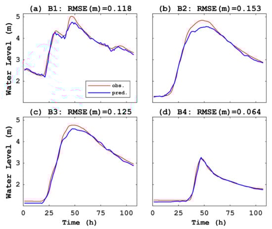 Figure 10 shows the comparison between the predicted water level and the observed water level in a time series during flood events in the test datasets of B1–B4 after the 20-time retrainings. These wave shapes tend to rise earlier than the observed wave that actually increased before the peaks. The predicted wave curves had small oscillations or non-smoothness.