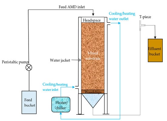 In the current study, three laboratory-scale water-jacketed reactors were operated in parallel in a downflow mode. The schematic diagram of the lab-scale reactors is shown in Figure 1. The lab-scale packed bed reactors contained the following components: feed and effluent buckets, peristaltic pumps (Watson-Marlow Fluid Technology Group, Johannesburg, South Africa), water-jacketed columns, and a PolyScience Whispercool® (PolyScience, Niles, IL, USA) heater/chiller for temperature control. Each reactor consisted of a base section that functioned as a stand and housed a conical section with an outlet at the bottom of the cone. Above the conical section was a perforated plate with 1 cm holes. The reactors were 1 m in height and 0.15 m in internal diameter, and they had a total working volume of 8 L. A piece of silicone tubing, with an outer and inner diameter of 1 cm and 0.7 cm respectively, was connected at the bottom of the cone. The tube was routed up the column to near the top edge. A T-piece was fitted at the top of the tube to assist in fluid level adjustment. The water jacket of the reactor was connected in closed circuit with a heater/chiller unit with a built-in pump that recirculated water through the water jacket of the column. The feed water for each reactor was stored in 10 L or 25 L plastic buckets, where it was pumped to the top of the column using a variable flowrate Watson Marlow 120 series peristaltic pump. The reactor overflow was collected in a 15 L bucket for each column.
