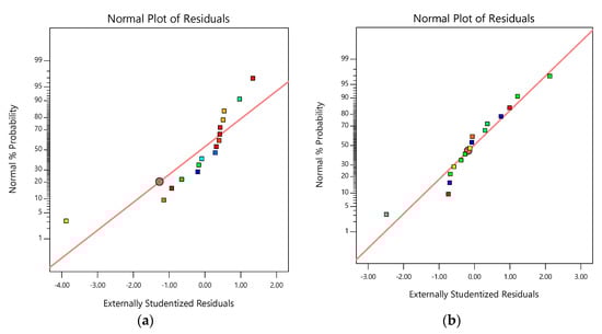 Figure 2. Normal plot of residuals for (a) sulphate reduction efficiency and (b) sulphate reduction rate.