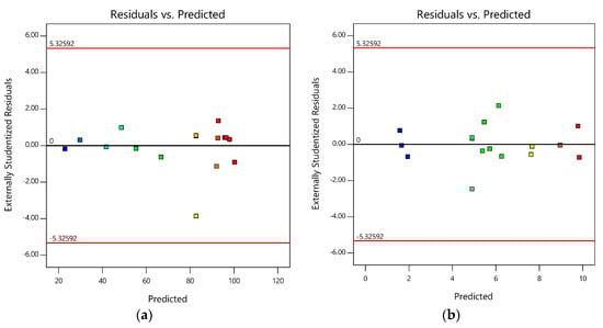 Figure 3. Plot of residuals vs. predicted for (a) sulphate reduction efficiency and (b) sulphate reduction rate.