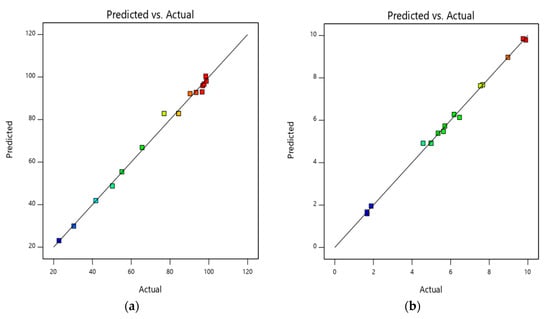 The data obtained from the 16 experiments that were conducted were fitted into polynomial quadratic equations as shown in Equations (5) and (6) in terms of coded factors.