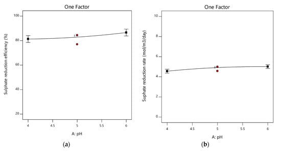 Figure 5a,b shows the effect of pH on sulphate reduction efficiency and sulphate reduction rate, respectively. From the graphs, both responses slightly increase with an increase in pH from pH 4 to pH 6; however, the increase is not significant. This is evident in Table 3, where pH was insignificant for both responses. This shows that SRBs were not suppressed at an initial pH of 4, which is considered too low for SRB to grow [37]. This could imply that lower costs need to be expended for pH adjustment, and this could have a positive impact on the process’s operating expenses. Sulphate reduction at pH approximately 4 was highly impacted in some studies [38,39,40], which may be because the reactor pH was controlled [39]. However, Jong and Parry [34] found a sulphate reduction efficiency of above 80% when the reactor’s influent pH was 4.07. For this study, only the influent pH was controlled, and the average effluent pH, for experiments that had an influent pH of 4, was above 6, as shown in Figure 6. Jong and Parry [34] also observed an effluent pH of above 6. As a result, there are uncertainties about the pH at which sulphate reduction occurs if only the influent pH is controlled, as the effluent pH is always higher [41].