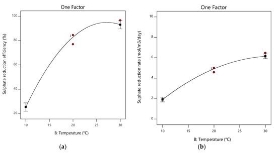 The effect of temperature is depicted in Figure 7a,b. Decreasing temperature from 30 to 20 °C with HRT and pH at the centre point had a minimal impact on SRB activity, which was expected, as 20 °C is in a range that supports the growth and activity of SRB, as also observed in other studies [42,43,44]. A further decrease in temperature from 20 to 10 °C slowed down the metabolic activity significantly. Sheoran et al. [10] suggested that sulphate reduction is likely to decrease by 50% at temperatures lower than 10 °C compared to sulphate reduction at 20 °C. Similarly, the same effect can be observed from the graphs. The sulphate reduction efficiency and sulphate reduction rate decrease by more than 50% with a decrease in temperature from 20 to 10 °C. According to the graphs, the sulphate reduction efficiency decreases from approximately 80% to about 25%, and the sulphate reduction rate decreases from approximately 5 to 2 mol/m3/day when the temperature is decreased from 20 to 10 °C with HRT and pH kept constant at the centre point.