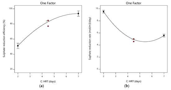 Figure 8a shows that the sulphate reduction efficiency response increases as the HRT increases from 2 to 7 days. Conversely, the sulphate reduction rate decreases with increasing HRT from 2 to approximately 5 days, followed by a slight increase with a further increase in HRT to 7 days, as shown in Figure 8b. Although sulphate reduction efficiency was observed to decrease with decreasing HRT, the sulphate reduction rate increased with a decrease in HRT due to higher feed rates. A longer HRT resulted in higher sulphate reduction efficiency but lower sulphate reduction rates. Similar observations were made in earlier studies [45,46,47,48].