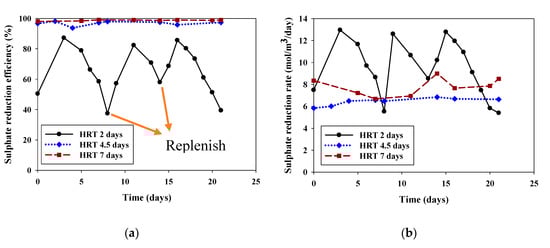 Figure 9. Effect of HRT over time at 30 °C and pH 5 for (a) sulphate reduction efficiency and (b) sulphate reduction rate.
